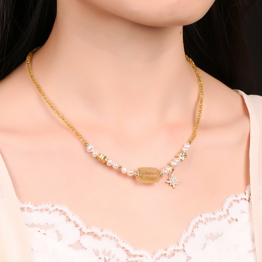 黃水晶八芒星吊墜女 閃光繁星發絲 金發晶項鏈淡水珍珠
