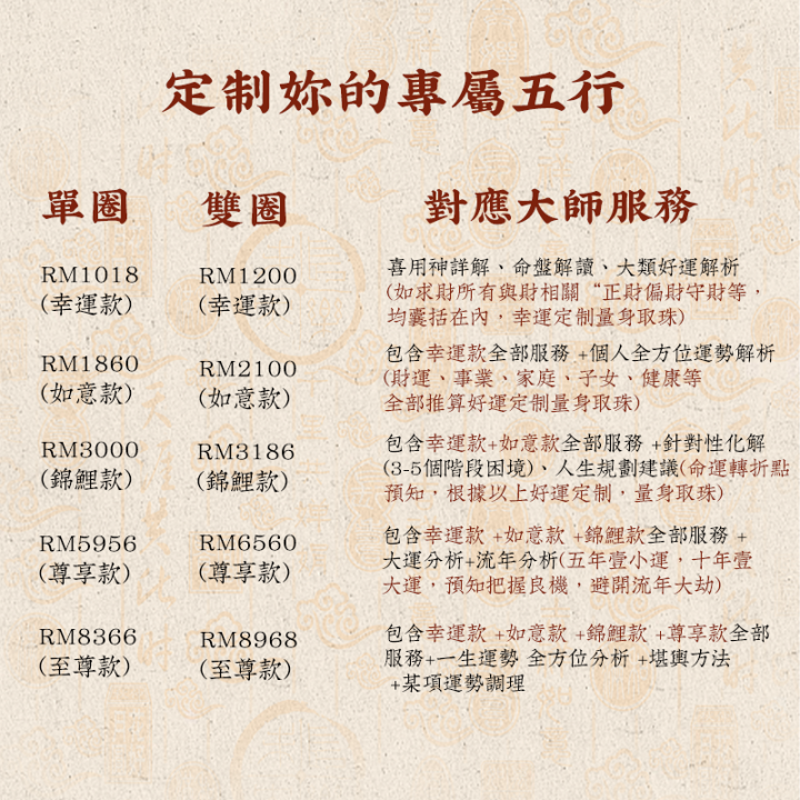 - 精準平衡: 你的五行是獨一無二的。定制能精確分析你命盤中金、木、水、火、土的強弱與關係,針對性地補足或化解不平衡之處。